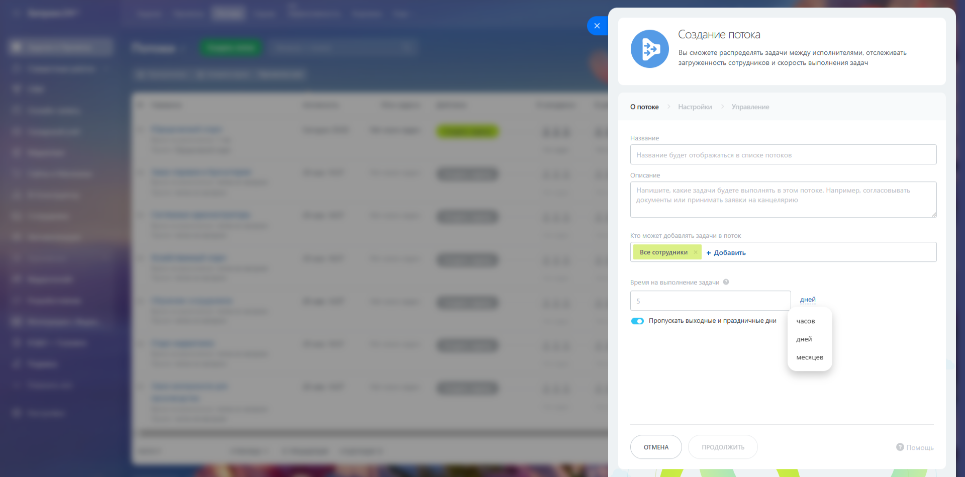 Если вы хотите создать Поток с нуля, нажмите на кнопку «Создать Поток». В открывшемся окне необходимо заполнить основную информацию о Потоке. Дайте Потоку понятное название и краткое описание — чтобы все участники понимали, за что именно отвечает этот поток. В поле «Кто может добавлять задачи» отметьте сотрудников, которые смогут создавать задачи внутри Потока — это поможет ограничить круг постановщиков и сохранить порядок.