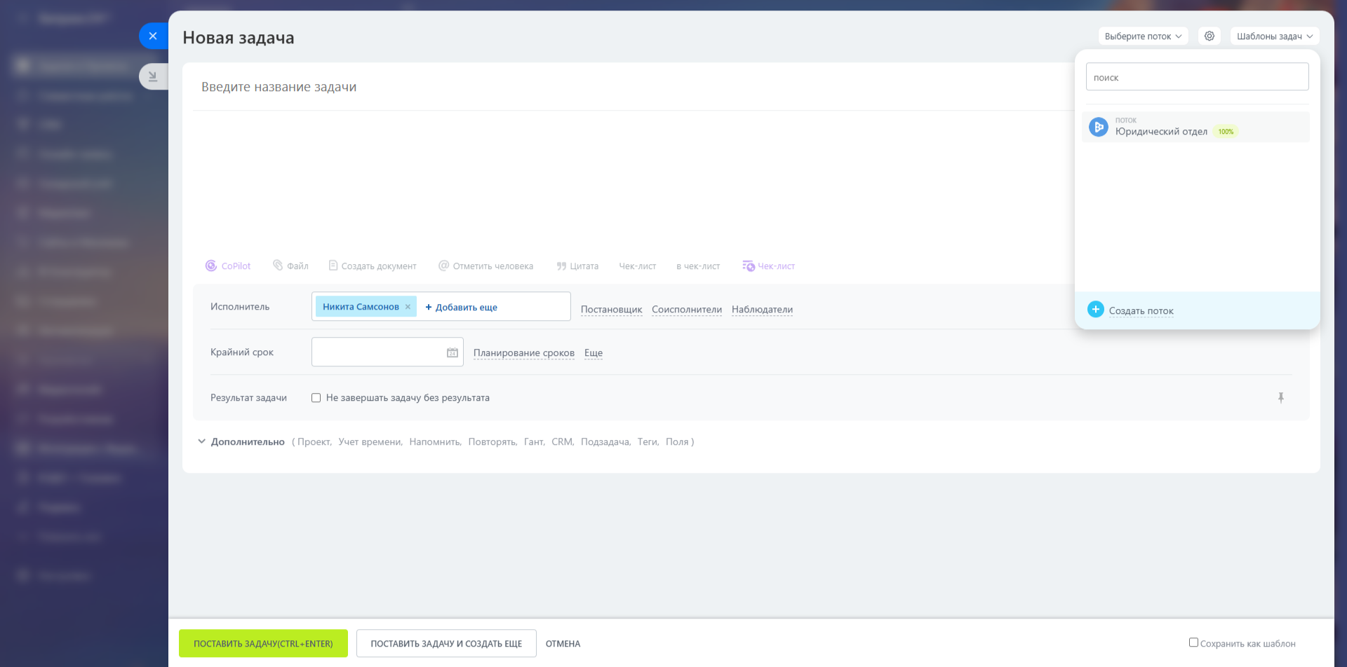 2. Из других инструментов Битрикс24. Начните создавать обычную задачу и выберите в верхней части формы нужный Поток. Далее — всё как обычно: введите название, добавьте описание, при необходимости включите напоминания, учёт времени и другие параметры. Исполнитель, срок и проект подтянутся автоматически — их определит сам Поток по своим правилам. Остаётся только нажать «Поставить задачу», и она сразу уйдет в работу.