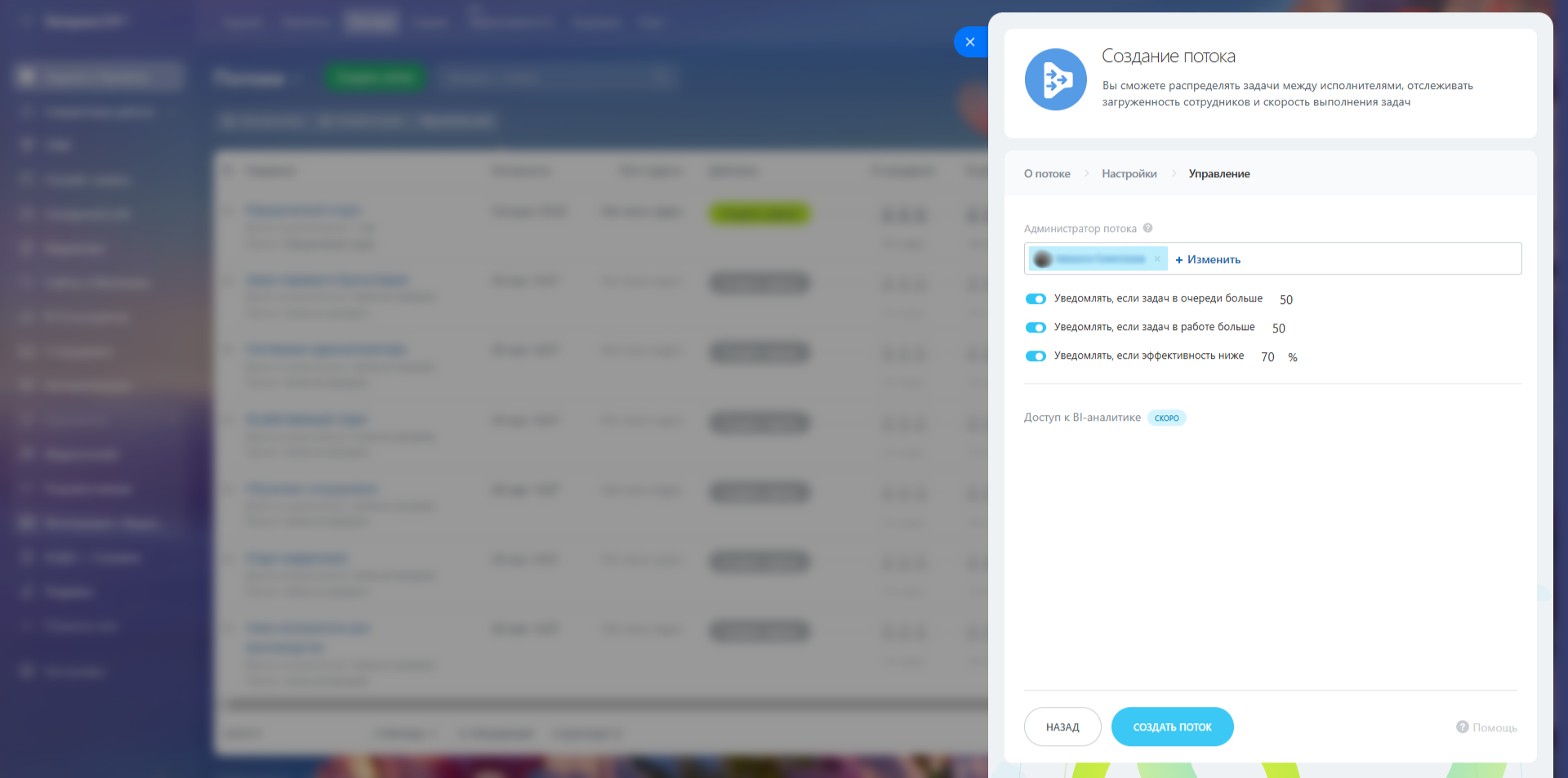 Когда основные настройки заполнены, нажмите «Продолжить» и перейдите к управлению Потоком. Здесь важно назначить администратора Потока — это человек, который будет следить за ходом выполнения задач, получать уведомления о перегрузках и падении эффективности, а также менять настройки по необходимости. Настройте систему уведомлений — она предупредит, если в очереди задач слишком много, если много задач в работе, или если общая эффективность упадёт ниже заданного порога.