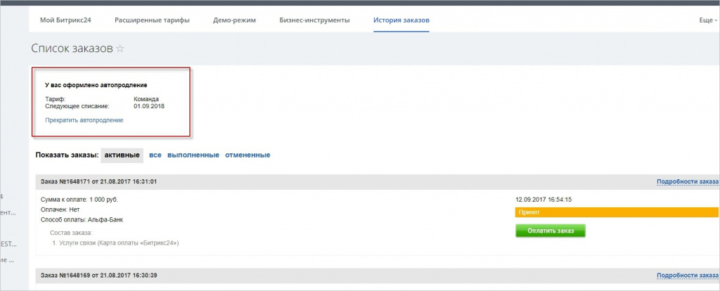 Автопродление Битрикс24 - это функция для автоматического продления вашего тарифа с помощью банковской карты. В любой момент автопродление можно убрать в разделе Мой тариф - История заказов